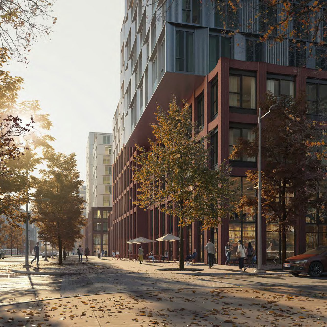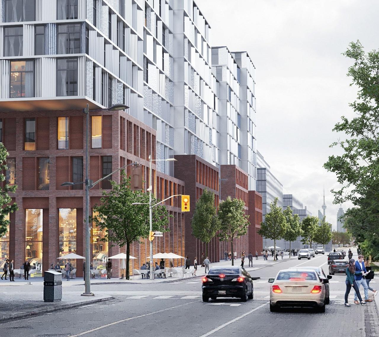 A proposed development in the Distillery District, designed by ArchitectsAlliance and COBE Architects, is a mixed-use structure featuring three buildings of 13 storeys each, with a combination of market-rate and affordable rental housing. The project’s Developer is Dream Unlimited, Kilmer Group, Tricon Residential and the Architect COBE Architects.
